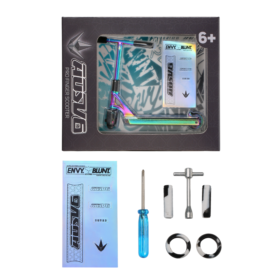 Take your scooter skills to the mini stage with the Envy AOSV6 Pro Finger Scooter — a premium, pocket-sized replica of the pro-level AOSV6 deck. Built from high-grade aluminium, it features a comfy finger pad, thermal-style bars, soft grips, and ultra-smooth headset and wheel bearings for a realistic ride feel.